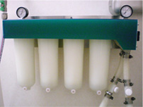 そこで、透析液のクリーンな状態を維持するために、ベッドサイドに送る前にさらに、透析液をクリーンにするフィルターを通し、より清浄な透析を供給できるシステムとしています。