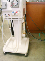 いくら他の所でクリーンな操作を行っていても、粉末透析溶剤を投入するときに細菌が入り込んでいては意味がありません。そこで当院では日機装社製の半閉鎖式透析液自動溶解装置DAD-30を導入しました。